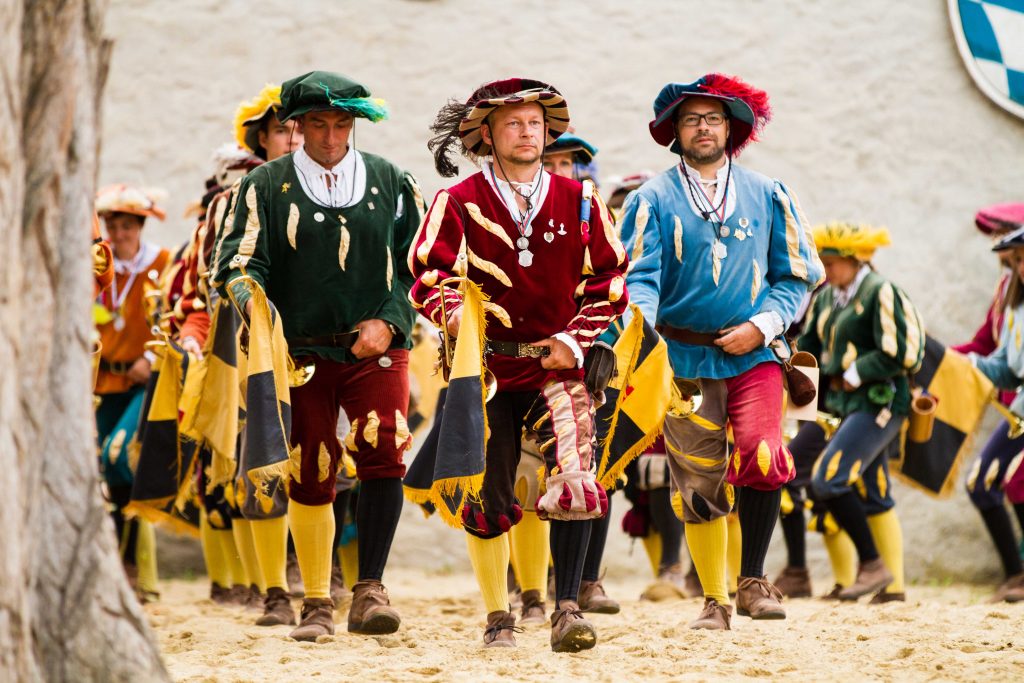 Freitag 17.00 Uhr, das Kostüm sitzt. Pünktlich stehen wir am Donaukai für den Empfang der Festgesellschaft. Ja, und dann geht´s auch schon los. Direkt nach der Stadtwache marschieren wir über die Luitpoldstraße den Stadtberg hinauf. Die breite Straße ist von Menschen gesäumt und am Altstadtberg ist jeder freie Fleck besetzt. Feierlich ziehen wir in den Schloßhof ein. Wir spielen ein paar Stücke zur Eröffnung des Festes durch Neuburg´s Oberbürgermeister und marschieren gleich wieder aus – die Reiterspiele warten auf uns. Nach dem Turnier und einem Umzug durch die Altstadt haben wir endlich auch mal eine kleine Pause. Eigentlich sollten wir dann noch ein kleines Standkonzert auf dem Festival der Spielleut spielen, doch stattdessen kam der Regen und die Veranstaltung wurde abgesagt. Problem: eigentlich wollten wir nach dem Konzert noch mit den befreundeten Gruppen auf unseren 40.Geburtstag anstossen. Und weil wir eben wir sind haben wir uns kurzerhand trotzdem in Bewegung gesetzt und sind in den fast leeren Schloßhof einmarschiert. Tja, aus dem kleinen Standkonzert wurde ein großes und aus dem überschaubaren Publikum schnell eine erkleckliche Menge. Es hatte zu regnen aufgehört und mit jedem Stück von uns trauten sich mehr Zuschauer durch das Tor in den Schlosshof. Und es hat so richtig Spaß gemacht! Unser absolutes Highlight! Und natürlich waren danach auch noch ein paar Freunde zum Anstossen da.