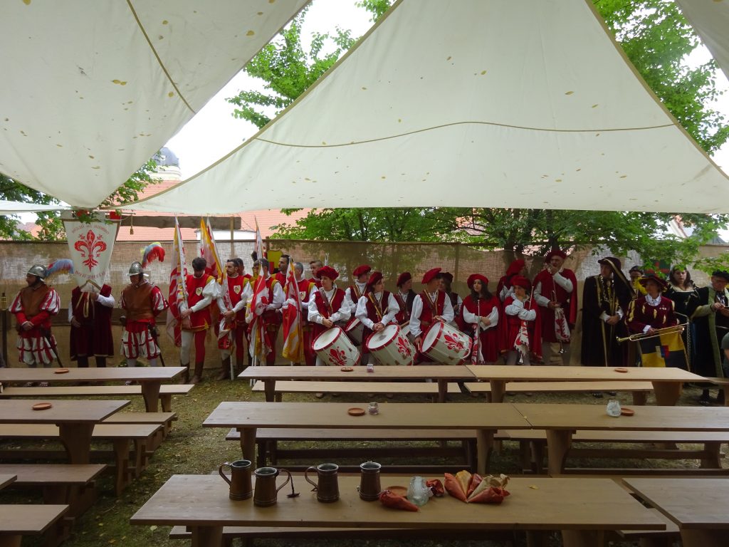 Der Samstag begann wie immer mit dem Putzen der Burgwehr und dem auffüllen der Schänke nach dem ersten Ausschank-Abend. Und dann haben wir unsere Gäste offiziell begrüßt. Zunächst einmal unsere Freunde, die Fanfarenzüge Perkeo Heidelberg und Graf Toerring Gernlinden. Seit vielen Jahren schon bereichern sie das Schloßfest und unterstützen uns bei unserem prall gefüllten Terminkalender. Und dann hatten wir noch jemand neuen zu begrüßen, die „Bandierai e Musici di Castel San Barnaba“ aus Scarperia e San Piero – einer Kleinstadt nahe Florenz. Und nach der gemeinsamen Markteröffnung hatten alle am Nachmittag gut zu tun. Die Italiener hatten ihren Auftritt im Schloßhof, die Gernlindener waren für die Reiterspiele zuständig, die Heidelberger haben den Tanz der einfachen Leut´und den Steckenreitertanz begleitet und wir waren für die musikalische Umrahmung des Stadtempfangs im Schloßhof zuständig – und natürlich dafür, daß die Burgwehr-Schänke läuft.