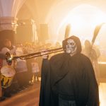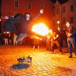 Während wir die ersten Stücke anstimmten, sprangen die ersten Todesmutigen schon über die lodernden Flammen am Ottheinrichplatz, das traditionelle Ritual zum Auftakt des Neuburger Weiberfaschings. Natürlich war auch wieder „Spectaculum de diabolico“ vertreten, um den Zuschauern zusätzlich einzuheizen.
